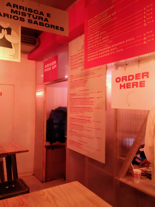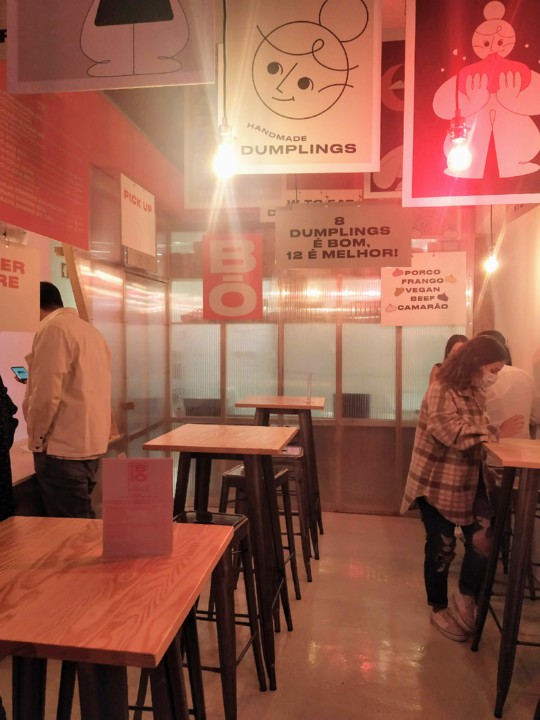 Já tinha passado os olhos por algumas fotos no Instagram da Madam Bo, onde se destacavam as várias cores dos dumplings e o próprio espaço, que faz lembrar uma ruela algures na Ásia que, apesar de nunca lá ter ido, reconheço dos filmes como o sitio de eleição para uma boa refeição à "local". Quando lá cheguei ao restaurante, que fica ali em pleno Príncipe Real onde sempre fui muito feliz, foi isto mesmo que confirmei: a sensação é que estamos na rua mesmo estando dentro do restaurante, nessa tal ruela no meio de uma infinidade de sítios para comer comida rápida e saborosa. As mesas e cadeiras estão lá, mas penso que o objetivo é mesmo comer e seguir viagem, não estamos num sítio para "fazer sala". É street food sem o ser, acho que nós Portugueses ainda não estamos preparados para comer sem sentar o rabo... Mas adoro o conceito!